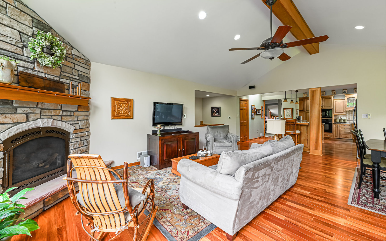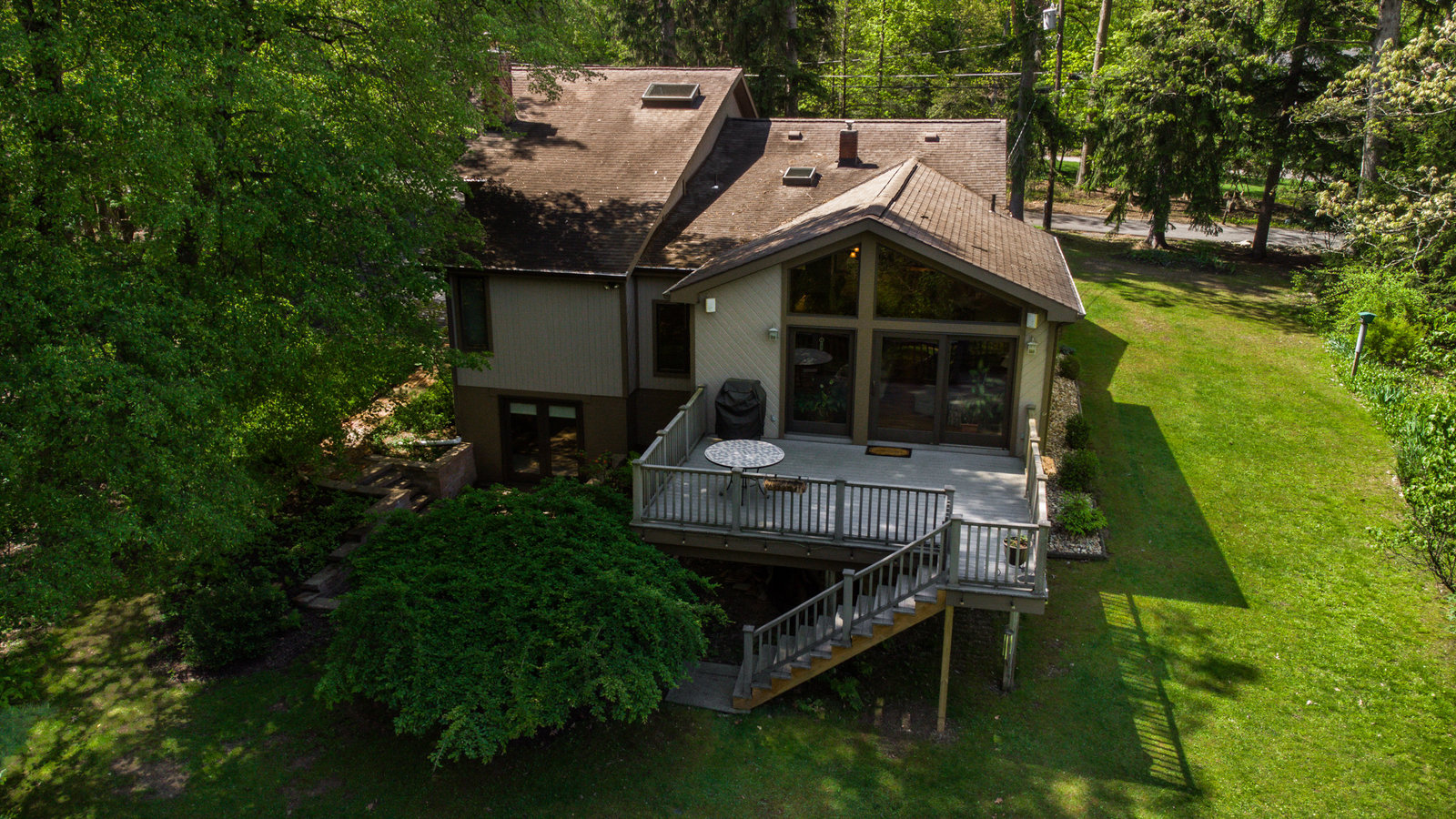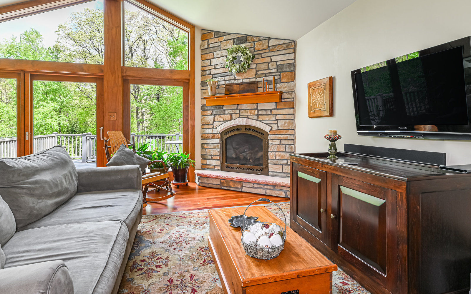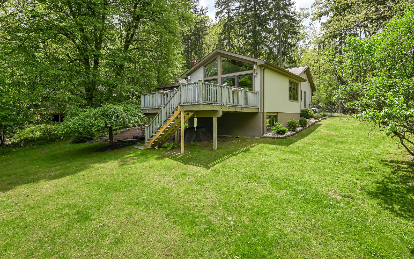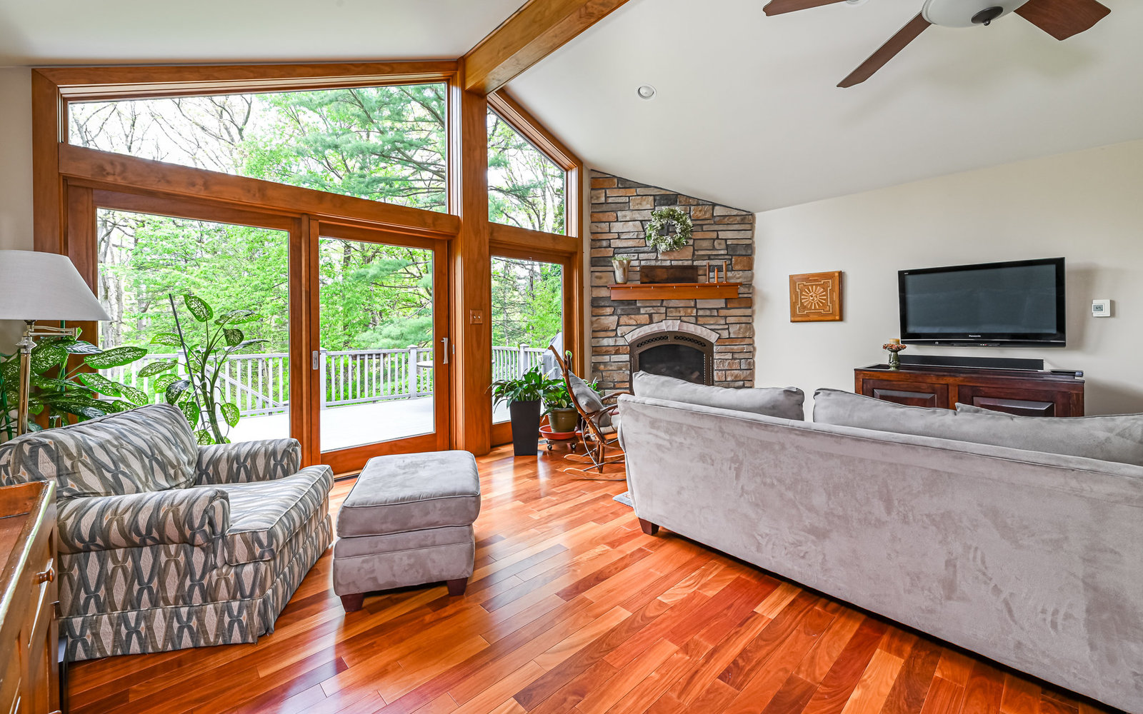 Gorgeous contemporary home in Bradford Woods - North Allegheny School District. Large windows allow ample natural light into this home's interior, while vaulted ceilings add a spacious feel, and mahogany hardwood floors bring warmth to the living spaces. The kitchen is a chef's dream, boasting granite counters, a breakfast bar with seating, and beautiful solid wood cabinetry with tons of storage. Entertain friends or gather around the stone fireplace in the great room. A sliding glass door leads outside to the large composite deck, complete with gas hook-up for grill. The owner's suite features a spa-like bath with a custom tile shower and a dual sink vanity, and a large walk-in closet. The finished lower level offers additional living space for recreation or relaxation with a full bath and with newer Anderson sliding doors to the patio area -perfect for enjoying the peace and tranquility of Bradford Woods.