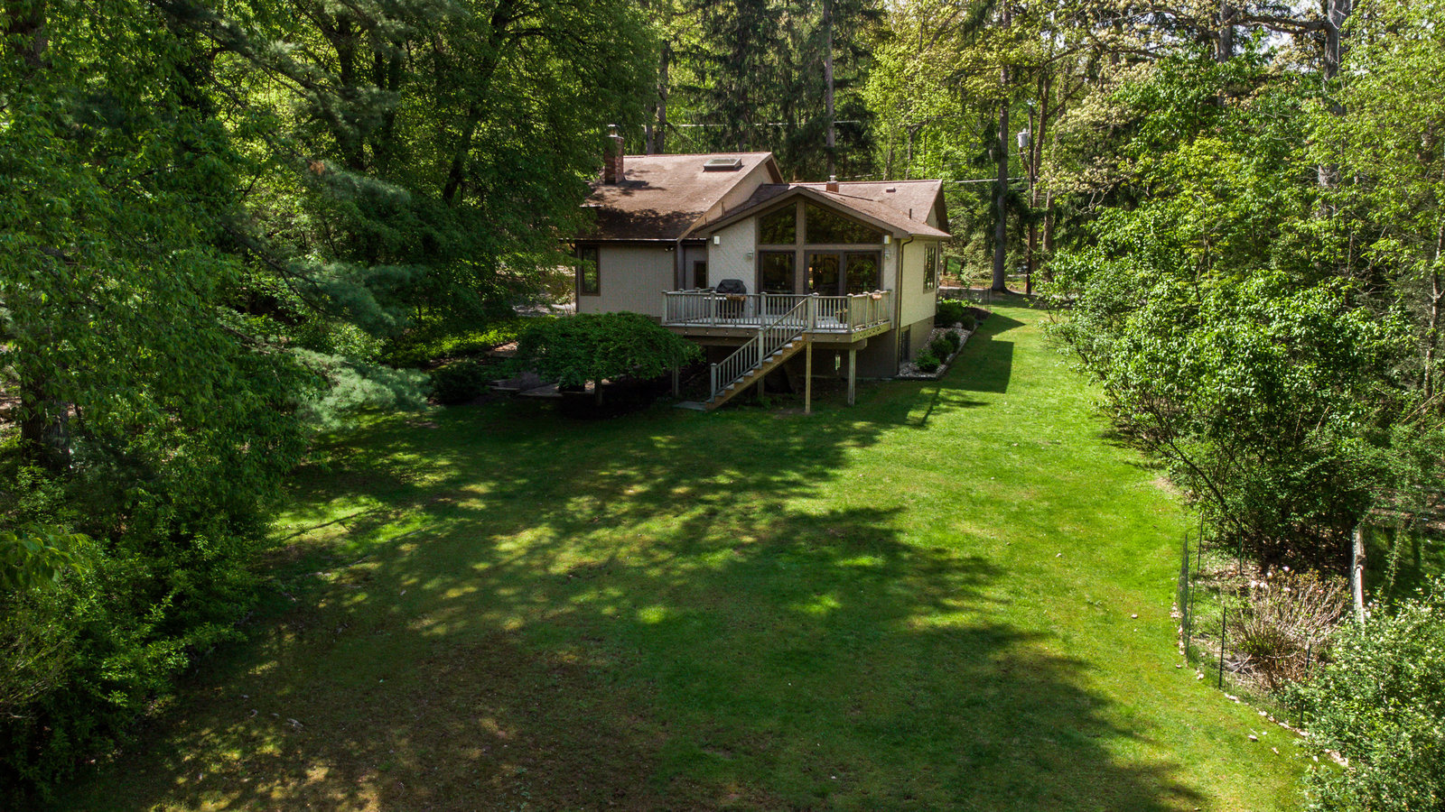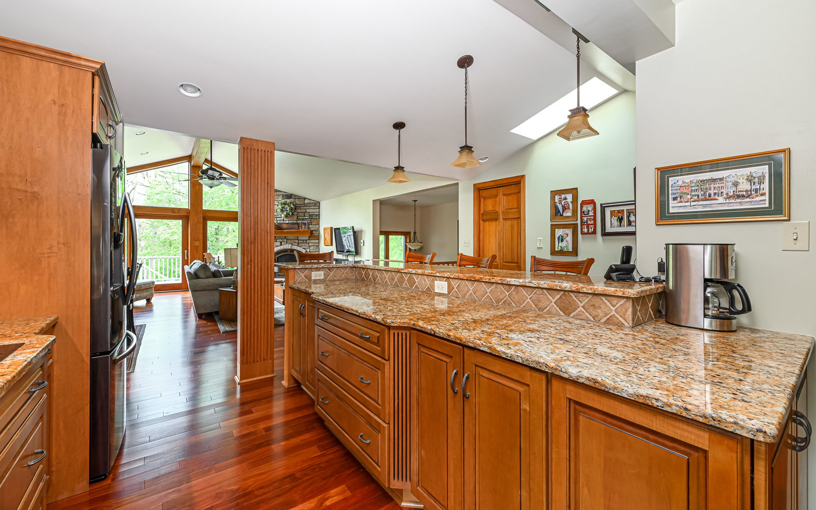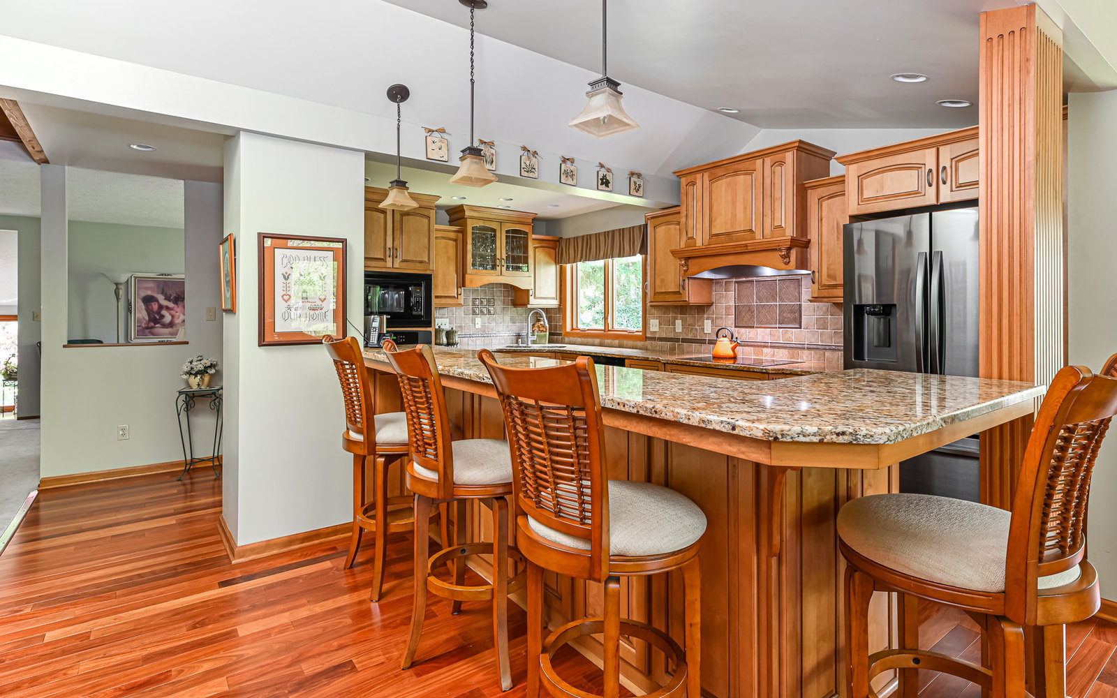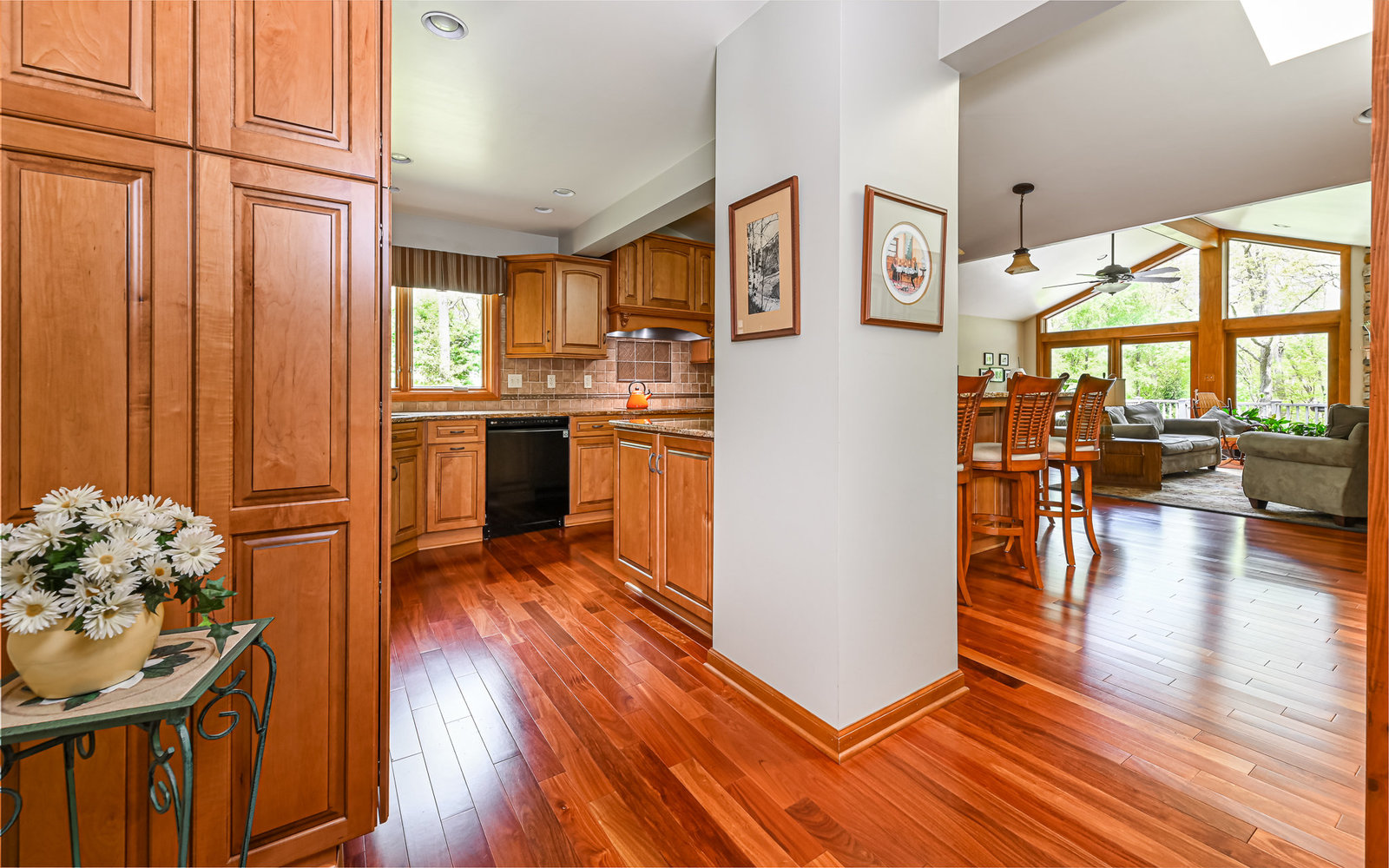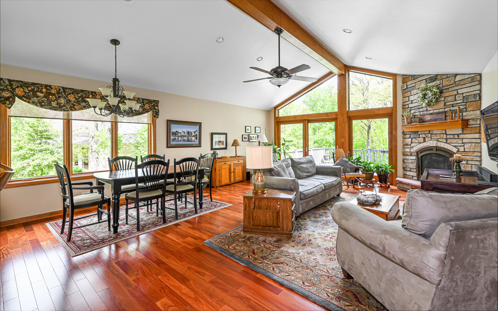 Gorgeous contemporary home in Bradford Woods - North Allegheny School District. Large windows allow ample natural light into this home's interior, while vaulted ceilings add a spacious feel, and mahogany hardwood floors bring warmth to the living spaces. The kitchen is a chef's dream, boasting granite counters, a breakfast bar with seating, and beautiful solid wood cabinetry with tons of storage. Entertain friends or gather around the stone fireplace in the great room. A sliding glass door leads outside to the large composite deck, complete with gas hook-up for grill. The owner's suite features a spa-like bath with a custom tile shower and a dual sink vanity, and a large walk-in closet. The finished lower level offers additional living space for recreation or relaxation with a full bath and with newer Anderson sliding doors to the patio area -perfect for enjoying the peace and tranquility of Bradford Woods.